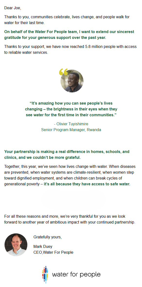 $7,500 to charity: water, amplified by $12,500 in matching and tripled gifts from anonymous benefactors, expanding sustainable access to clean water worldwide. This will provide 500 people access to clean water!
